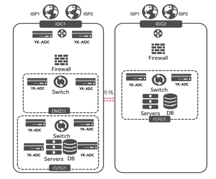 3、內網采用YK-ADC的RHI+OSPF和集群技術,做到IP架構的雙中心雙活應用調度