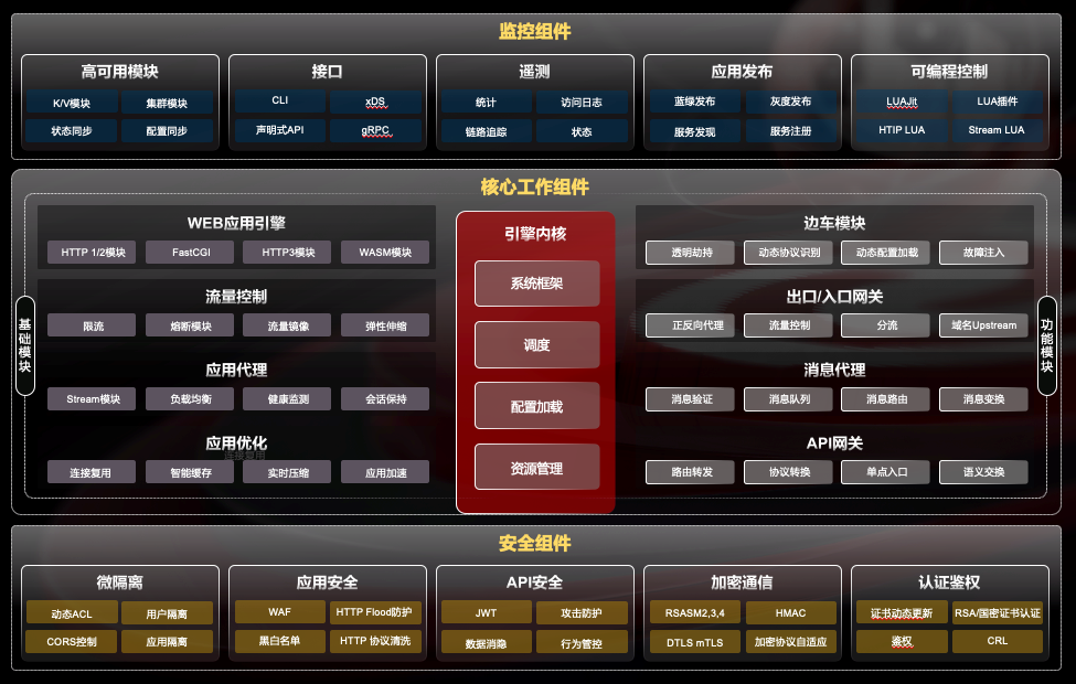 李剛強調,“OpenNJet 充分吸收了開源生態的優秀擴展模塊 ,在功能規劃上包含了5大類18類組件,特別是隨著安全威脅的快速增加,規劃了安全組件。除安全功能外,‘企業特性’也是OpenNJet關注的重點領域,如內置的高可用性,自動化的集群發現及配置同步等。”