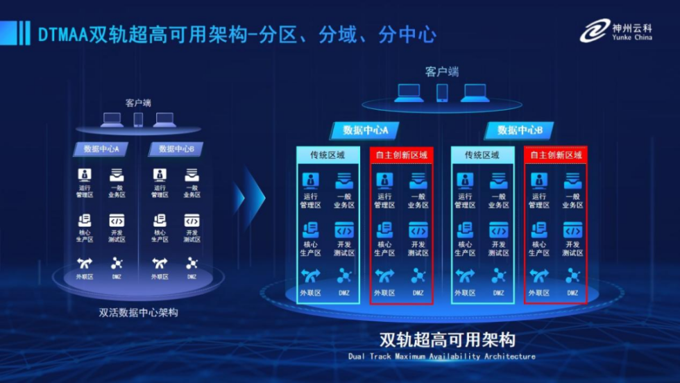 為幫助金融客戶更好地應對數字經濟時代對可持續性的高要求,實現“信創”與“數字化”齊頭并進,k8凱發推出了雙軌超高可用架構。該架構在雙活數據中心的分區調度基礎上,增加信創域和非信創域的分域調度,實行信創域與傳統域應用全量部署,使雙中心運營變為雙中心四區域并行運行,互為多活,將“0到1”的單軌建設道路變為分區分域協同的多活雙軌超高可用架構。幫助客戶在新架構下,保障“信創”的同時解決性能瓶頸,提升穩定性,保證應用可持續性,最終實現信創區域和非信創區域的平滑過渡,完成國產化替代目標。
