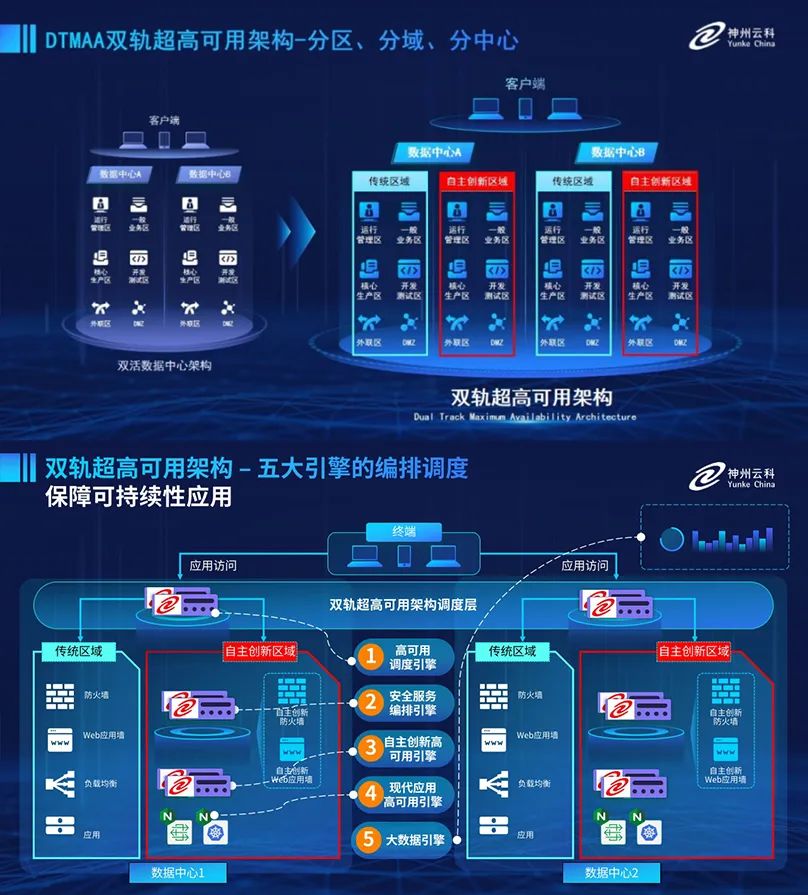 為助力銀行業(yè)務(wù)高質(zhì)量發(fā)展,更好地應(yīng)對(duì)數(shù)字經(jīng)濟(jì)時(shí)代對(duì)可持續(xù)性的高要求,實(shí)現(xiàn)“信創(chuàng)”與“數(shù)字化”齊頭并進(jìn),k8凱發(fā)創(chuàng)新性的推出了雙軌超高可用架構(gòu)。該架構(gòu)在雙活數(shù)據(jù)中心的分區(qū)調(diào)度基礎(chǔ)上,增加信創(chuàng)域和非信創(chuàng)域的分域調(diào)度,實(shí)行信創(chuàng)域與傳統(tǒng)域應(yīng)用全量部署,使雙中心運(yùn)營(yíng)變?yōu)殡p中心四區(qū)域并行運(yùn)行,互為多活,將“0到1”的單軌建設(shè)道路變?yōu)榉謪^(qū)分域協(xié)同的多活雙軌超高可用架構(gòu)。幫助客戶在新架構(gòu)下,保障“信創(chuàng)”的同時(shí)解決性能瓶頸,提升穩(wěn)定性,保證應(yīng)用可持續(xù)性,最終實(shí)現(xiàn)信創(chuàng)區(qū)域和非信創(chuàng)區(qū)域的平滑過渡,完成國(guó)產(chǎn)化替代目標(biāo)。