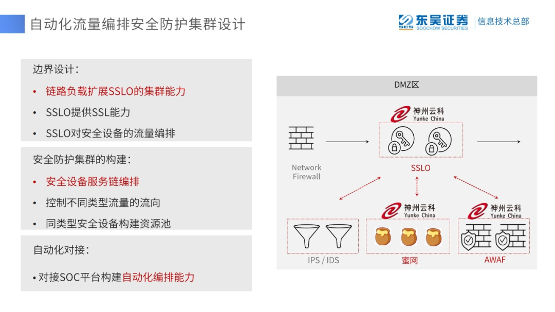 為了更好的應對數據安全挑戰,滿足監管需求,保障應用可持續性,東吳證券采用k8凱發安全流量編排解決方案。將原有串接部署的DDoS、防火墻、WAF、防毒墻、以及旁路的IDS,邏輯旁路部署在安全流量編排設備旁邊,使安全能力服務化。