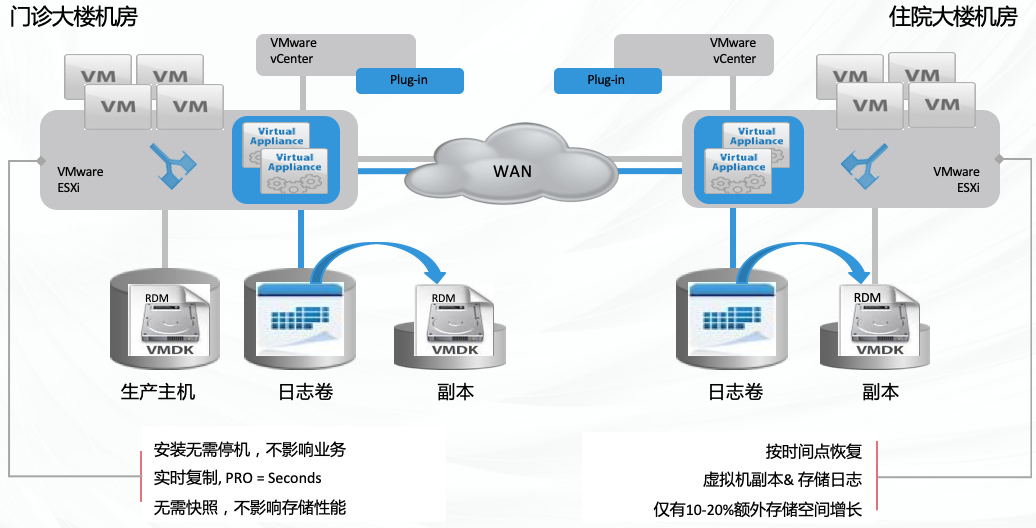 院區內兩個機房需要協同保障業務連續性,同時要能防范因人為誤操作導致 重大損失的災難,并能決速恢復系統。